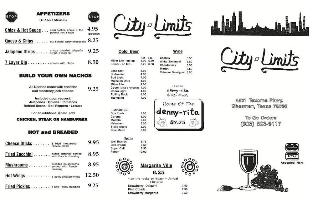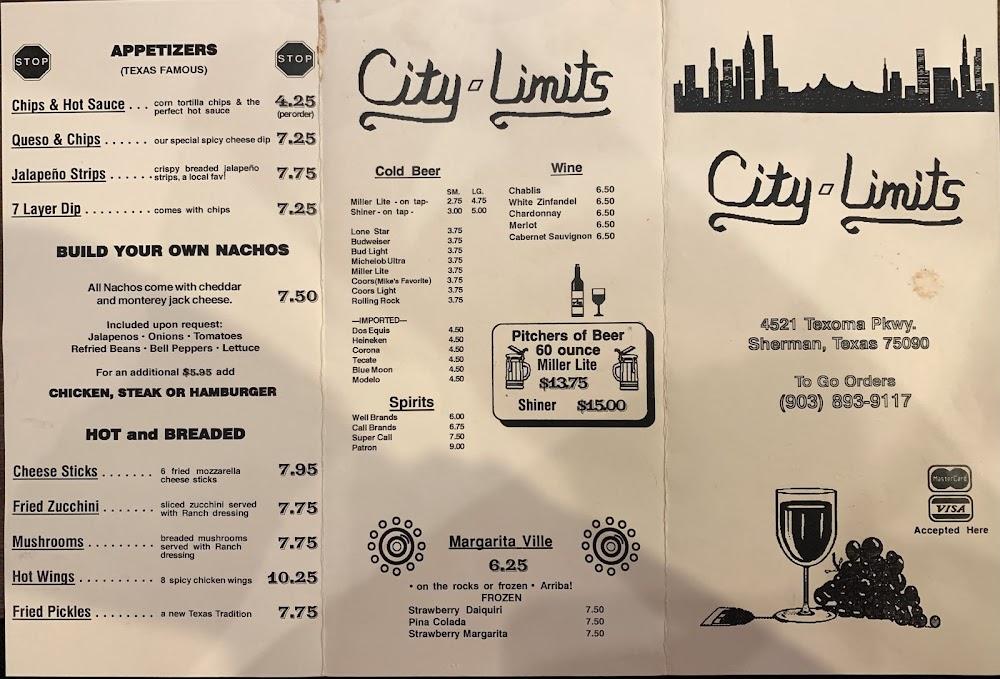 Welcome to City Limits, your favorite local dive in Sherman, Texas! Family-owned and operated, we pride ourselves on serving delicious food and cold drinks in a relaxed atmosphere. Located at 4521 Texoma Pkwy, our cozy restaurant features a diverse menu perfect for lunch or dinner, with options ranging from hearty grillades to vegetarian dishes. Enjoy our excellent cocktails and extensive beer selection, all while catching the latest sports events. With accessible seating and takeout available, we ensure everyone feels at home. Join us for a great meal and good times—take it to the limits at City Limits!